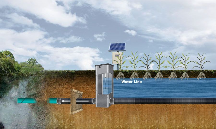 Typical drainage water management installation with an Inline Water Level Control Structure™.