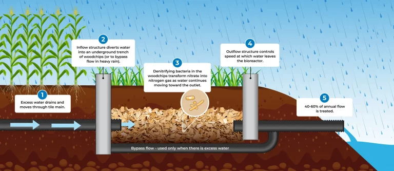 A denitrifying bioreactor is a water quality focused conservation drainage practice used to remove nitrates from subsurface drainage tile lines. A water control structure is used to divert drainage into an engineered and designed pit of woodchips, which use carbon in the wood as an energy source that supports soil microorganisms that convert harmful nitrates into gas.